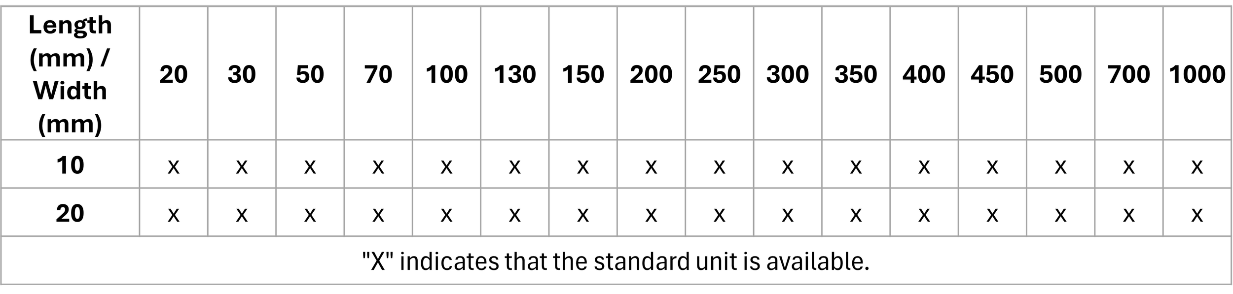 Find the perfect fit for your application in the table below, which shows our available standard irradiation areas. We also offer custom sizes and configurations, so feel free to reach out with your specific requirements.